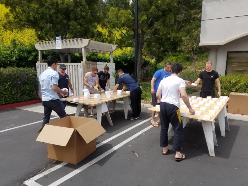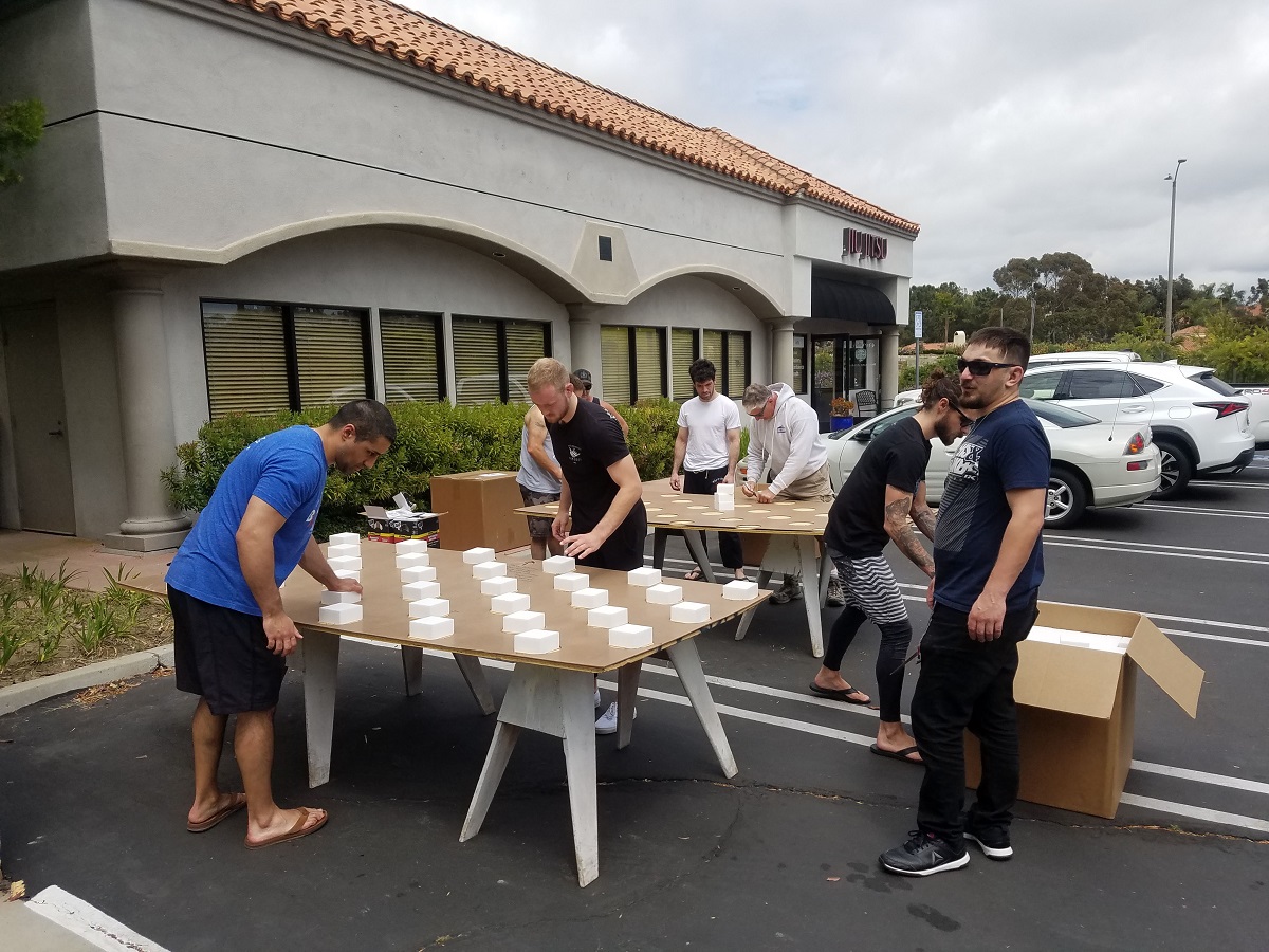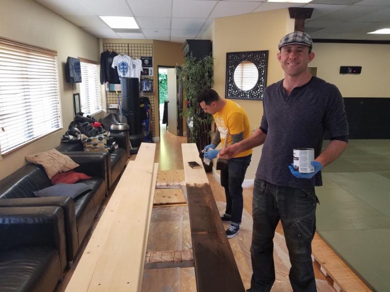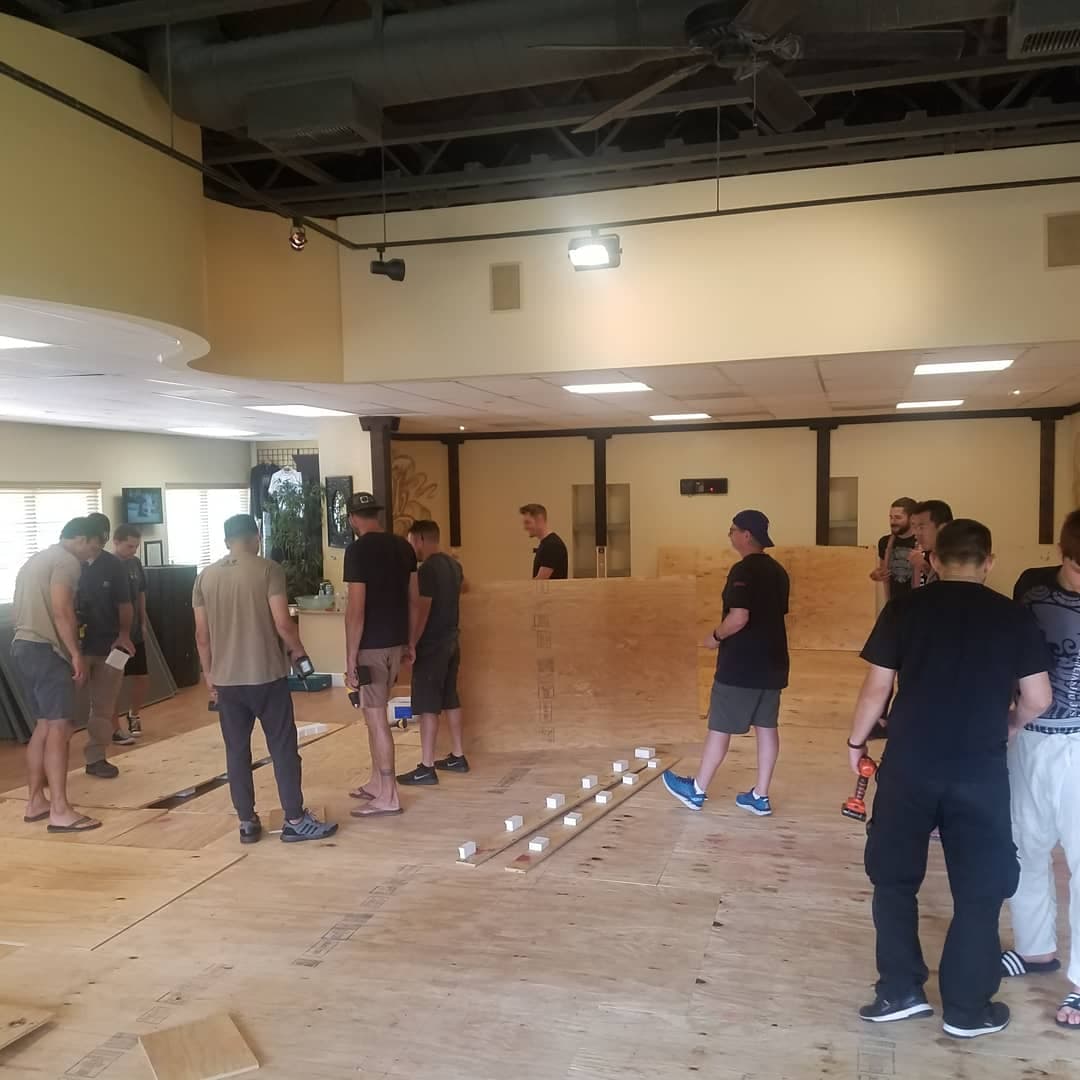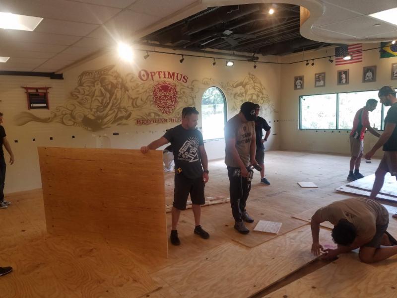 We did months of research before we began our new floor project. We concluded that 2 x 4 polystyrene foam blocks with two layers of 5/8 plywood on top would be the best option. We finished the floor with 1.5 inch Zebra Mats for a clean look of a dojo training hall. Our dedicated students volunteered their time to help during the installation, and we appreciate it. Local contractor and Optimus Black Belt, Bryan Grebbin supervised the team. After two long weekends our new floor was ready for Jiu-Jitsu action.