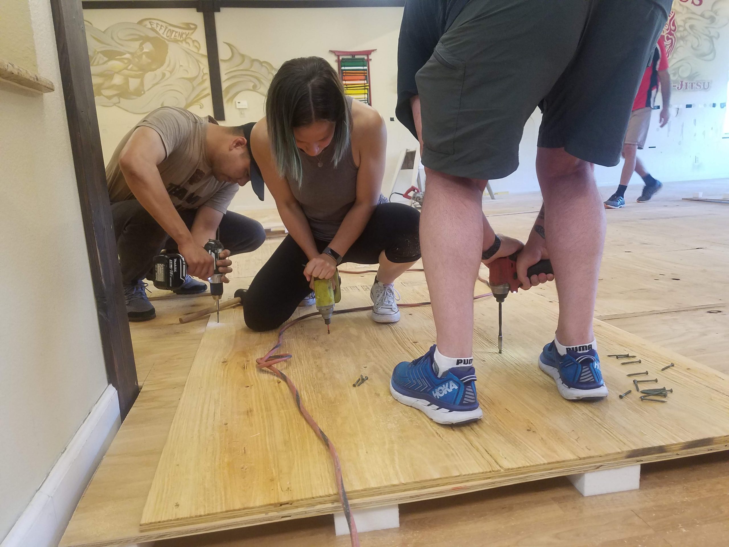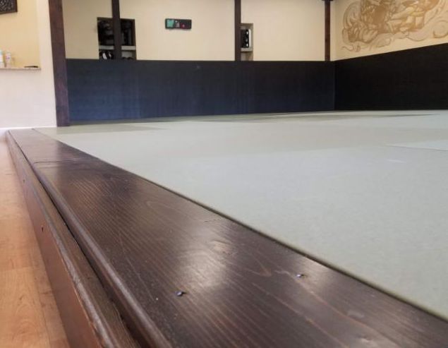 Most martial art schools place their mats on laminate floor or worse yet the cement. This is adequate, yet with heavy impact or falls it can be very hard on the body and unsafe. With a floating floor, the mats are placed on top of two layers of plywood which are suspended upon two inch foam blocks. The result is an incredibly responsive mat area that provides a springy cushion for hard Jiu-Jitsu training.